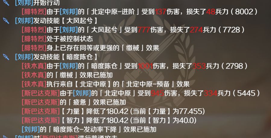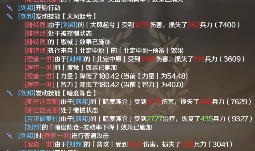 【暗度陈仓】在战斗中,在缴械效果重复的情况下仍在发挥自身的余热,为己方队伍进行治疗,在刘邦自身技能未进行有效控制时,【暗度陈仓】合理的触发了自身效果,并与【北定中原】进行了联动。