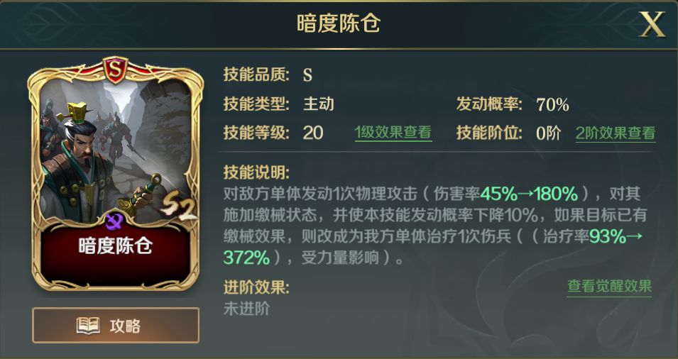 在目前版本中,更加强调的是收益性更高的技能与队伍配置,在S1的众多控制技能中,更多强调的是重复施加到敌方单体时,进阶效果转变为续控。而【暗度陈仓】则大胆的迈出了新的步伐,将进阶效果转变成为己方进行治疗。其治疗加成效果受到力量的影响,非常契合刘邦、李世民等力量型英雄。