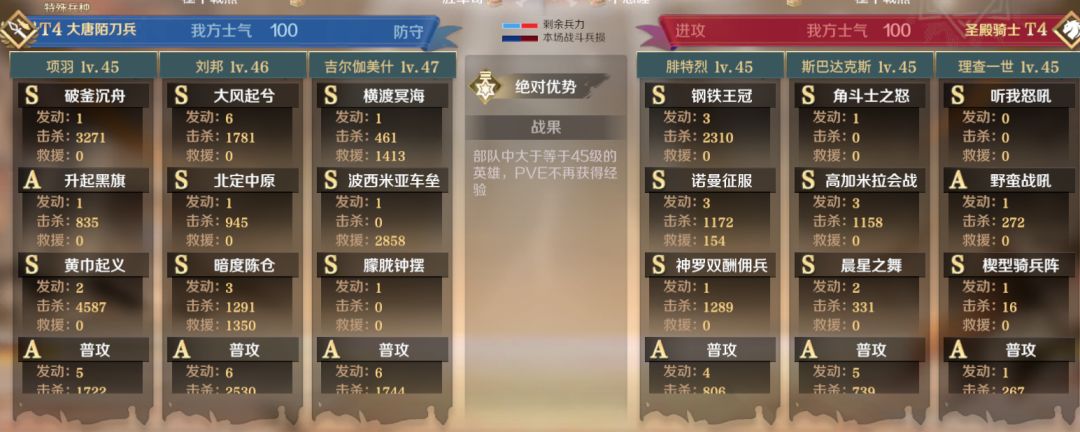 刘邦本身技能【大风起兮】可以在战斗前期提供稳定的沉默和缴械,配合【北定中原】和【暗度陈仓】,使敌方失去大部分的战斗力,并为项羽的技能触发提供了良好的环境。
