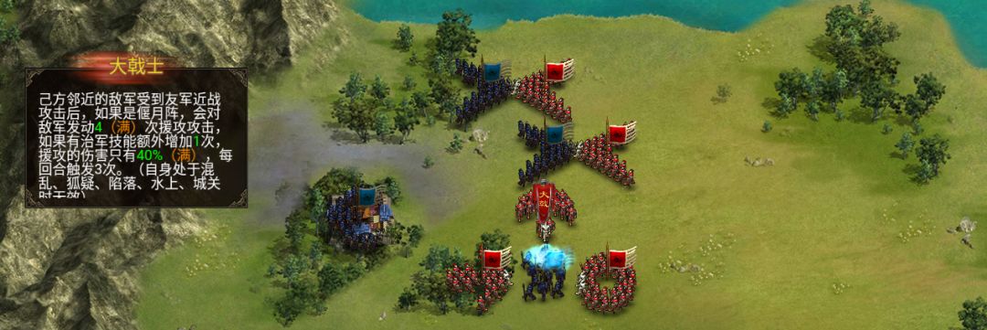 从图中可以看出,我方任意部队发起进攻,中间的“大戟士”都会协同进行近战攻击,并且不论本回合是否行动。