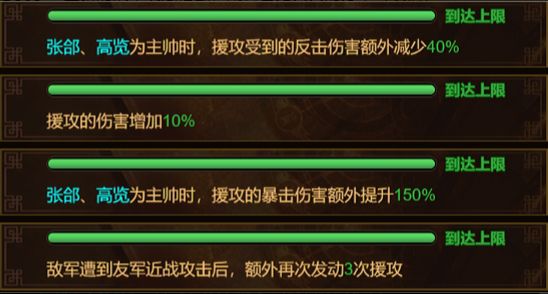 满训练的不仅在攻击力和防御力上有巨大提升,其第二词条“敌军遭到友军近战攻击后,额外触发3次援攻”,可以理解为,加上兵种特性的1次,一共可以触发4次援攻!如果有治军技能的话就是5次!这....这真的是不敢想象