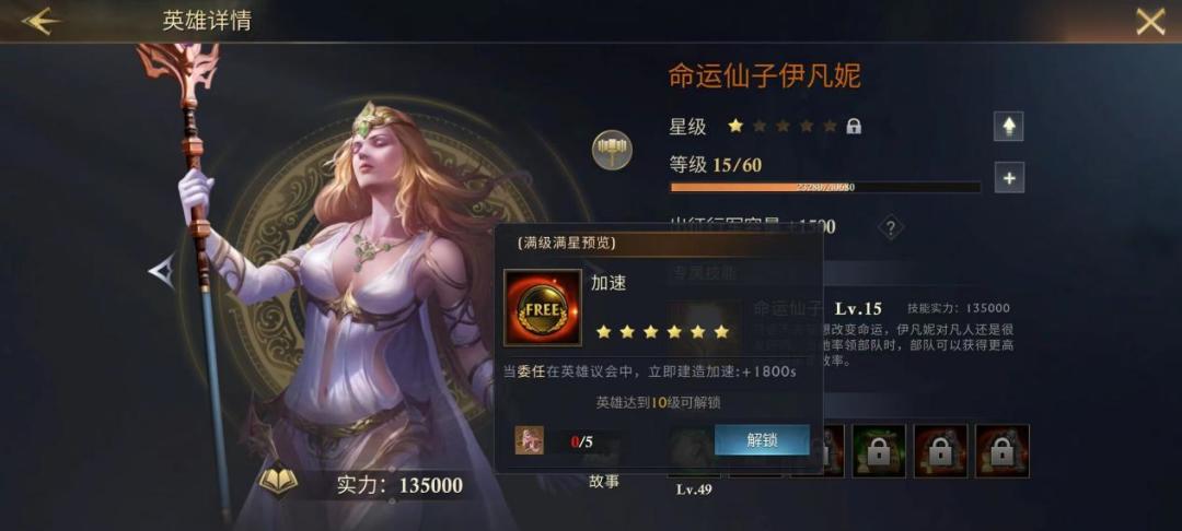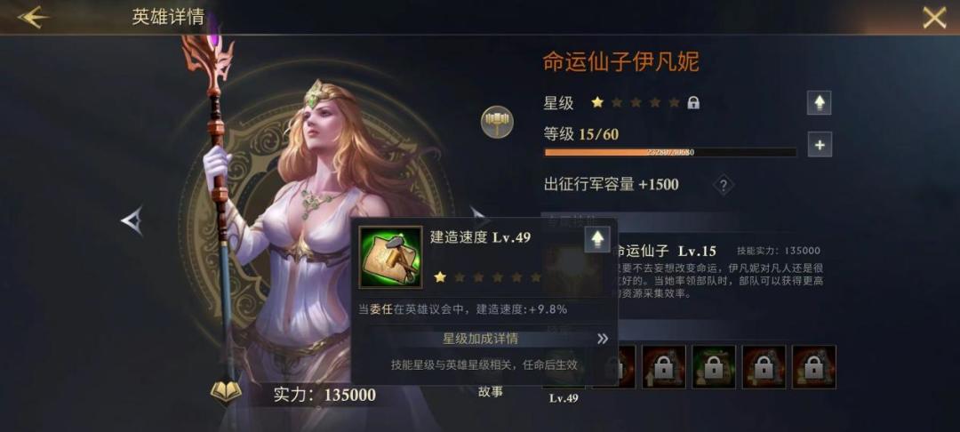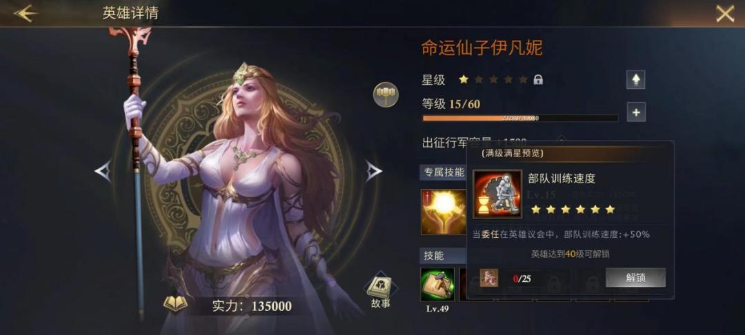 “部队训练速度”升满后造兵能提速50%,非常强的换装技能,就算玩家在英雄议会里有更好人选时也没关系,每当需要造兵时再换上伊凡妮就能行,拉满绝对不亏。