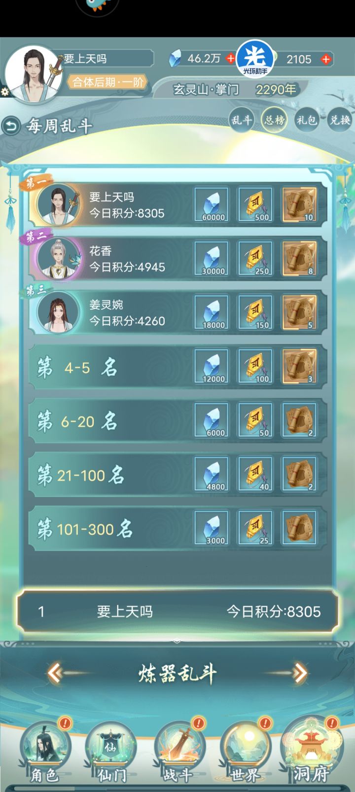 因为每周乱斗性价比最好的我觉得是练器,飞行,灵植,练丹,练药,霸主,灵兽都废时间对于没多少时间的0氪党我选择在练器上吊打他们直接拉开分数直接总榜第一 后面无论他们怎么追都追不上 哪怕你练满一星期练妖草 我练器直接就拉开你几千分甚至上万你还怎么追