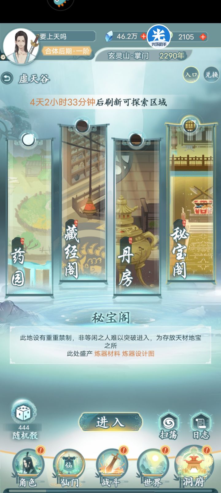 没错很简单就是仙门中的虚天谷!每天偶尔隔4小时上线把骰子买断4小时还是6小时刷新一次,还有免费刷新一次,一天100多颗,存6天600多还不算坊市刷新 仙王值兑换 一天150颗没问题!然后虚天谷选择出图纸的地方 光环点击器一挂美滋滋连自动探索也免了,一次大概7-8张图纸 腰牌还能兑换精准骰子 然后选择留着 刷玄尘运气好可以出金算是小福利吧。