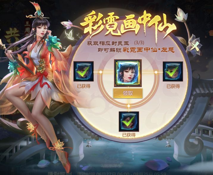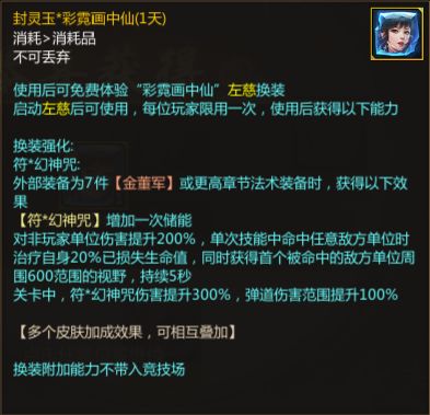 没有获取全部礼包的仙术师也可以在彩霓画中仙页面领取道具封灵玉*彩霓画中仙(1天),在召唤左慈后即可体验使用该换装,活动期间每位玩家限用一次哦~