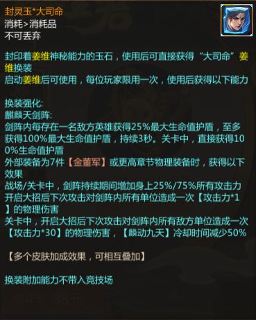 剑阵内每存在一名敌方英雄获得25%最大生命值护盾,至多获得100%最大生命值护盾,持续3秒。关卡中,直接获得100%生命值护盾外部装备为7件【金董军】或更高章节物理装备时,获得以下效果战场/关卡中,剑阵持续期间增加自身25%/75%所有攻击力开启大招后下次攻击对剑阵内所有单位造成一次【攻击力*1】的物理伤害关卡中,开启大招后下次攻击对剑阵内所有敌方单位造成一次【攻击力*30】的物理伤害,【麟动九天】冷却时间减少50%