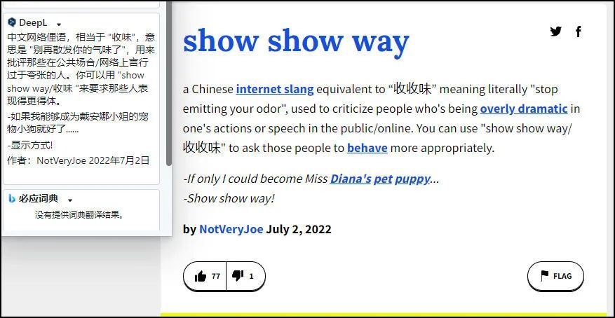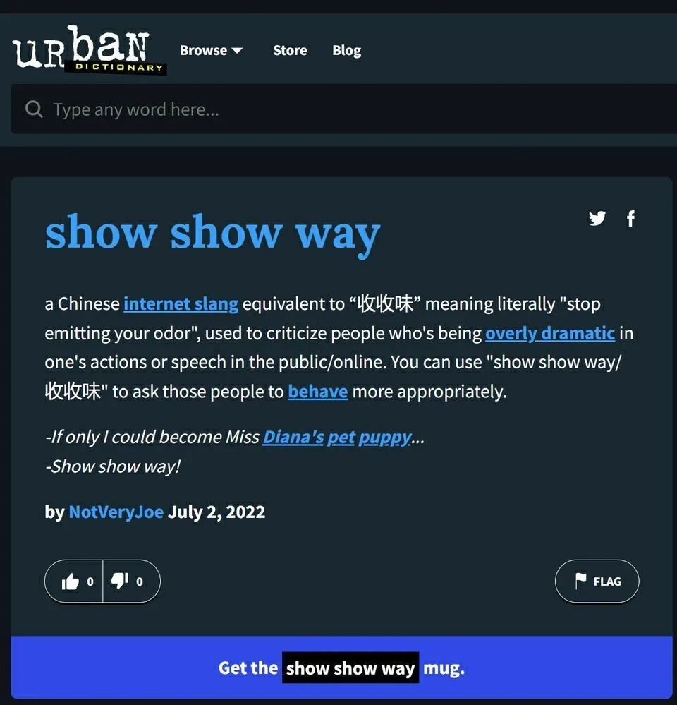 美国线上俚语词典网站“Urban Dictionary”,在近日收录了一个新词,“show show way”。