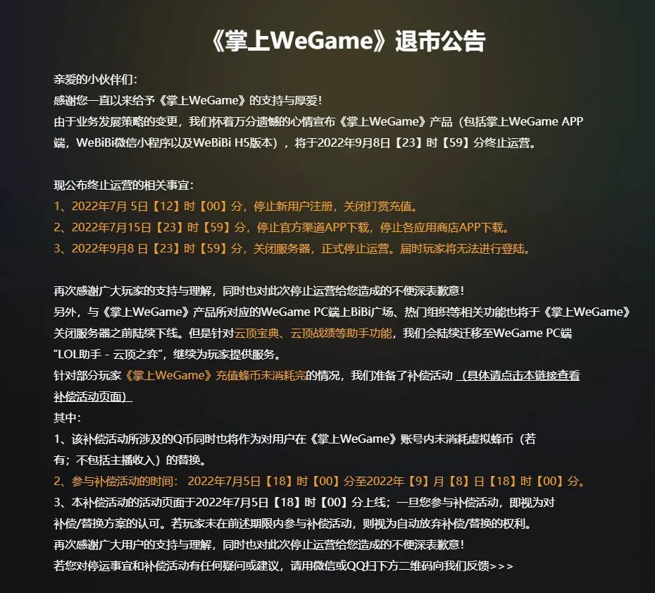 腾讯发布《掌上WeGame》退市公告:《掌上WeGame》APP、WeBiBi微信小程序以及WeBiBi H5版将于9月8日终止运营。