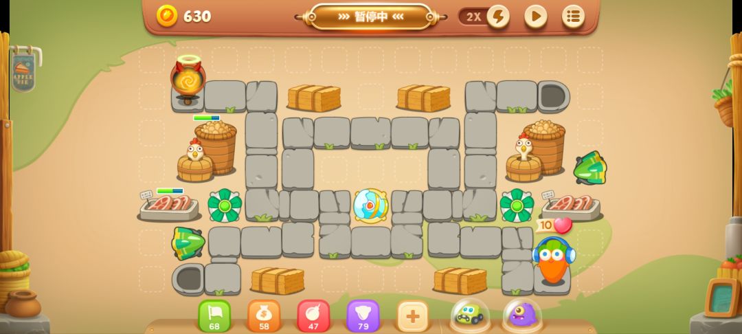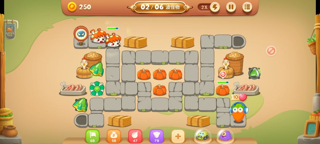 这关的要点是两个隐藏的风扇,先在左下角放一个导弹,把南瓜清理了,会出现一个风扇,升到满级。
