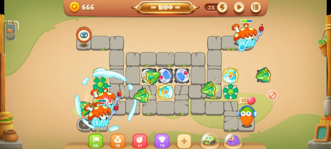 风扇自动清理怪物的时候会把中间的格子清理出来,这个位置放个减速炮塔,然后把右侧的风扇和导弹升满级。