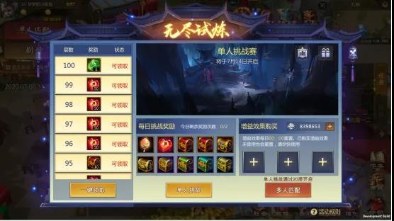 由于“无尽试炼”会在7月14日正式上线,那么我们第一届的“单人挑战赛”会在7月14日-7月21日进行,后面则从每月1日-7日开启。