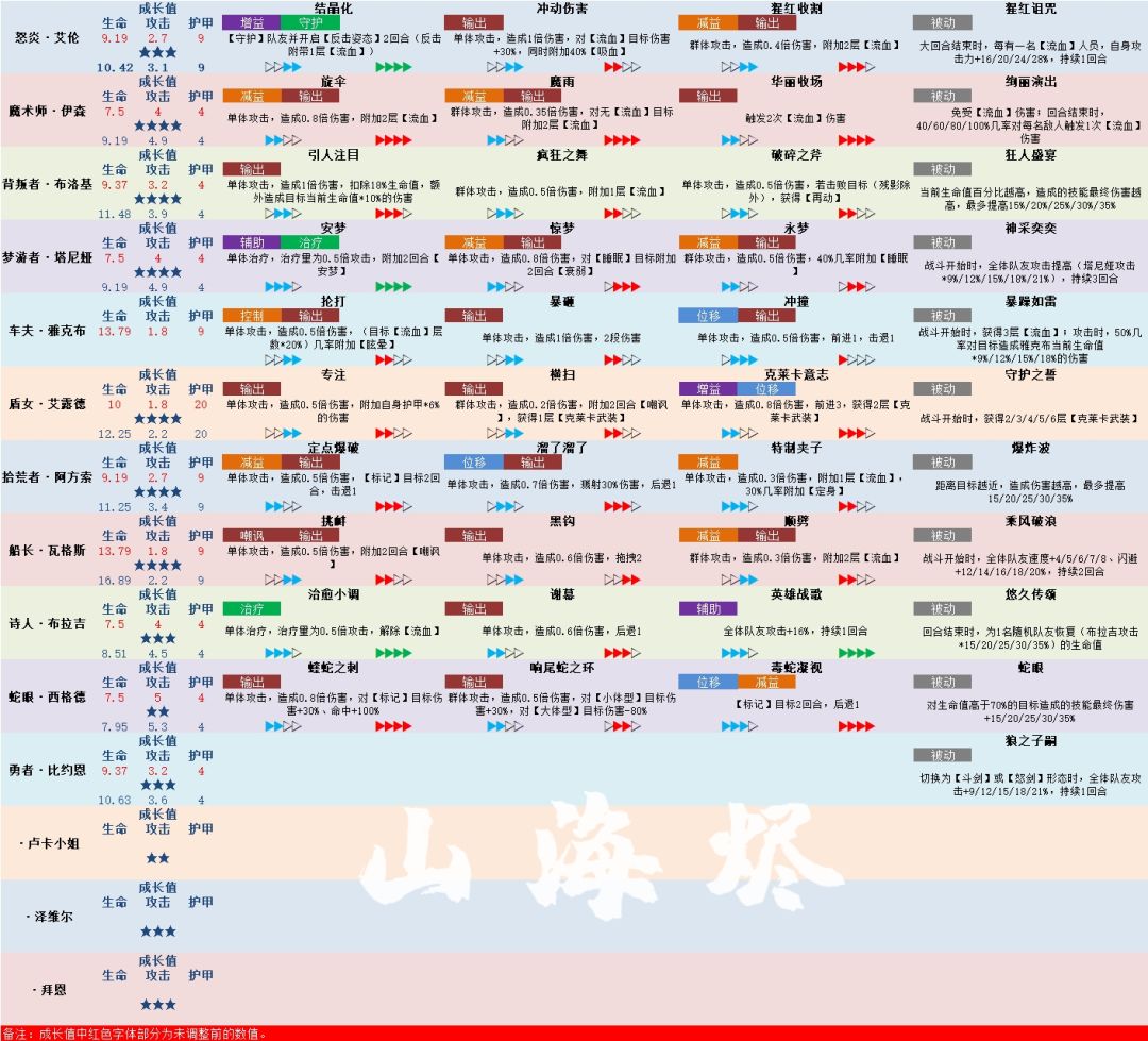 成长值部分按我现有星级看的,红色字体是未调整前的数值
