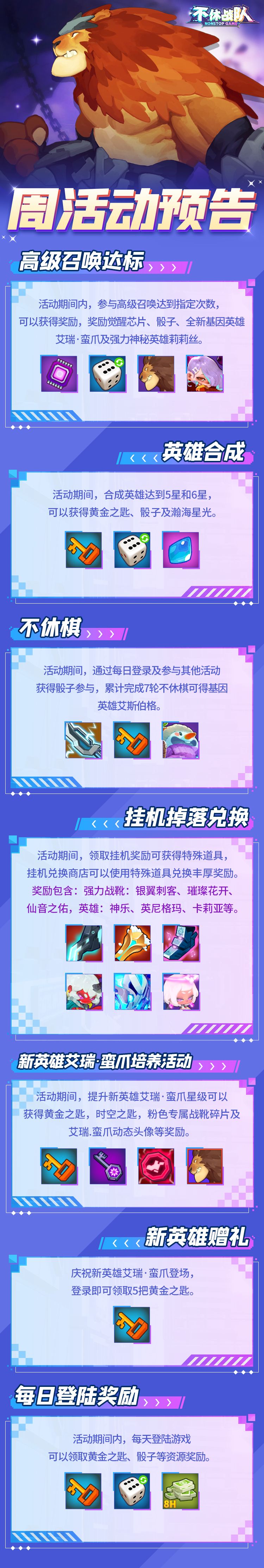 ③不休棋:活动期间,通过每日登录及参与其他活动获得骰子参与,累计完成7轮不休棋可得基因英雄艾斯伯格。