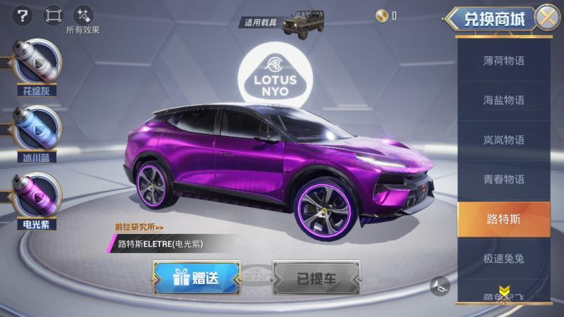 特种兵们可以通过新一期的五行兑换商城,花费3枚兑换徽章来获得全新的“路特斯ELETRE(电光紫)”车辆皮肤的基础款。