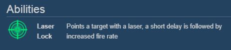 技能:激光锁定:短时间停火锁定敌人,之后增加射速直到目标消失或脱离射程
