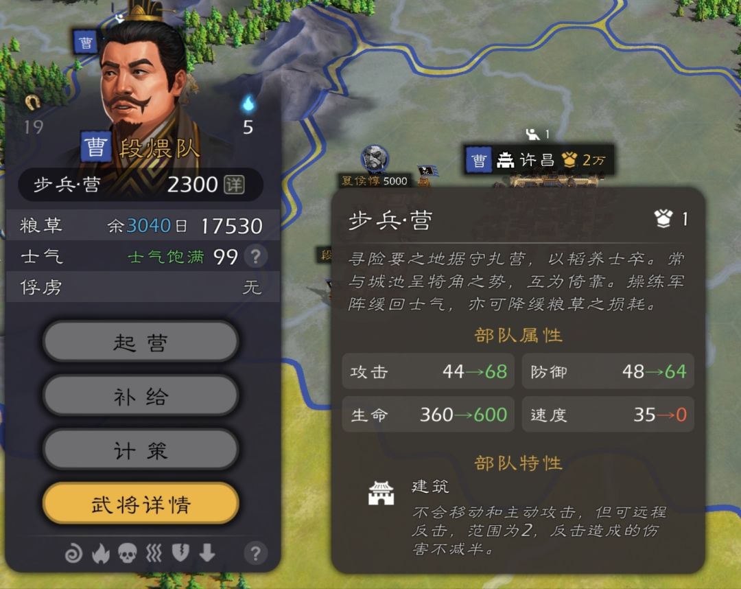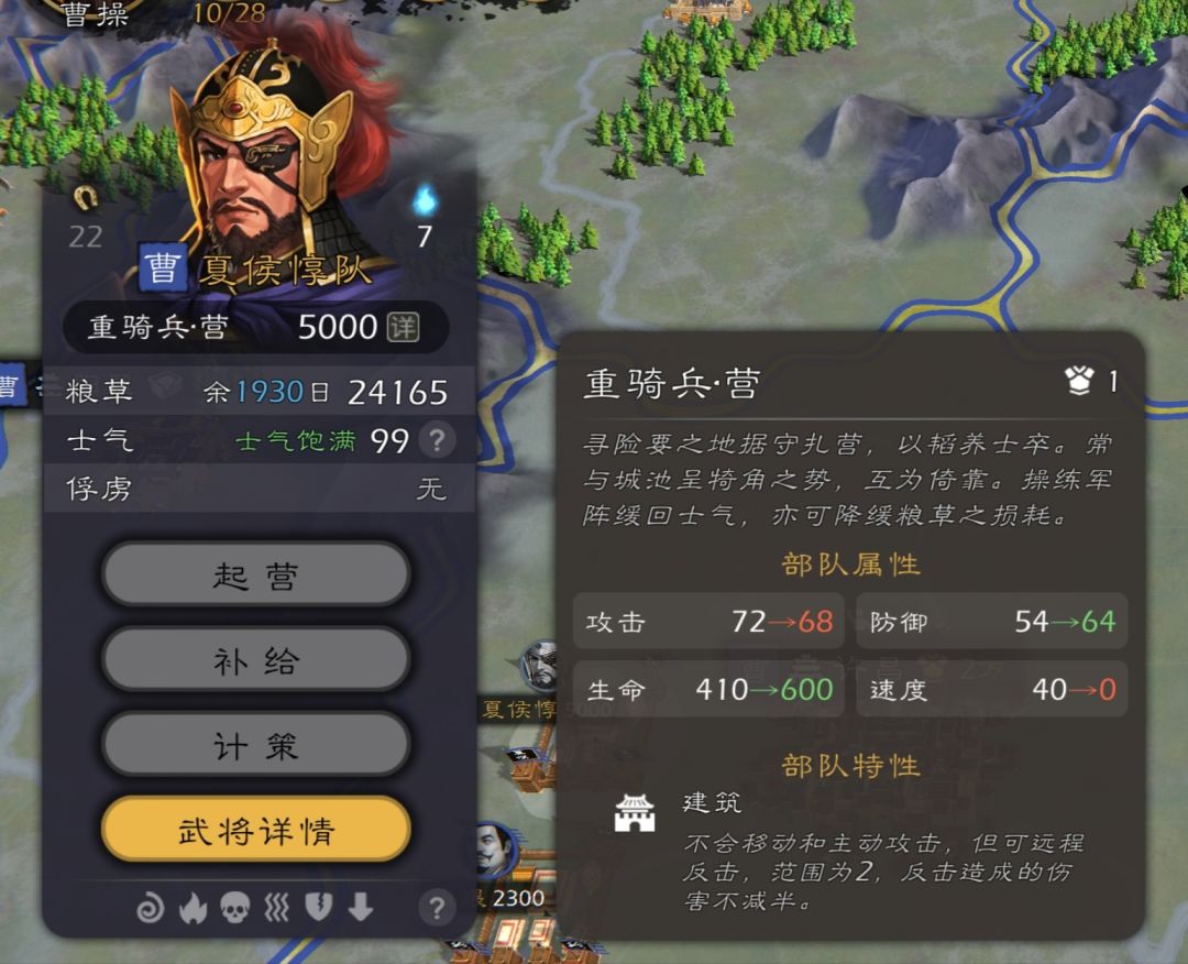 2、扎营的问题,无论什么兵种什么武将扎营是面板都会变成一个相当变态的样子,均为68/64/600且距离为2,反击甚至100的战争碉堡,应当调整为距离为1的防反为50且按兵种和统帅改变面板与反击能力的战略性手段。