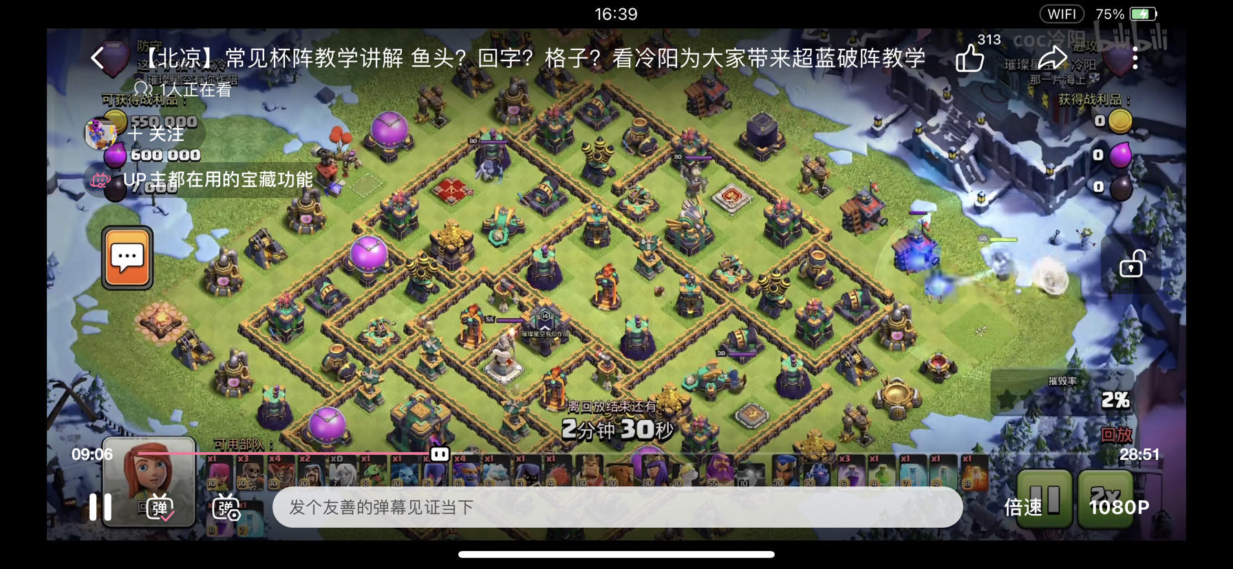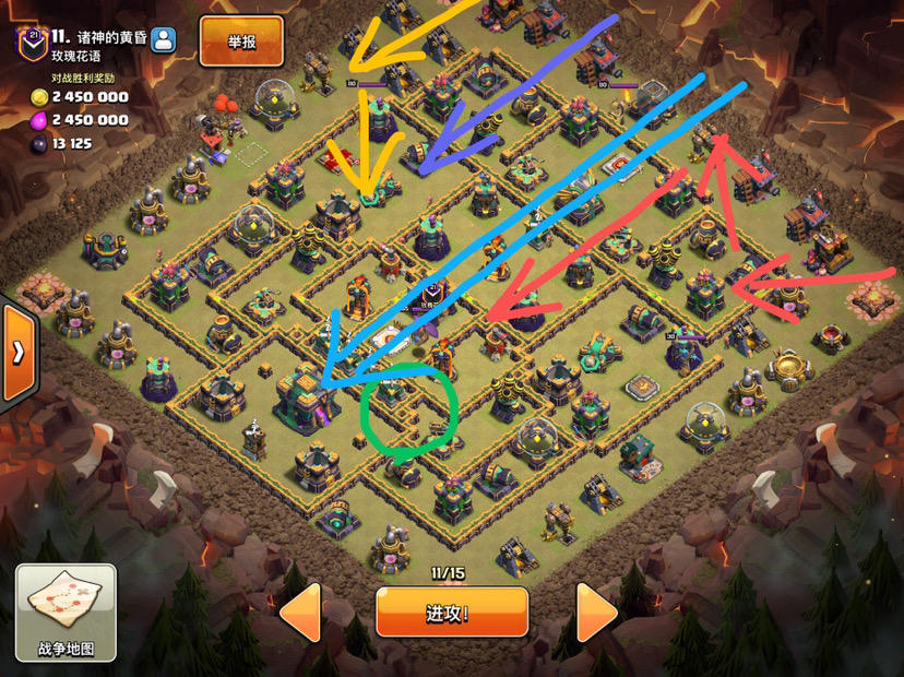 下午刚结束的这轮联赛,最后时刻,对方已打完15次,我方就剩我1次机会,对手领先我们3颗星及57%摧毁,保两星已无意义,必须三星才能赢。