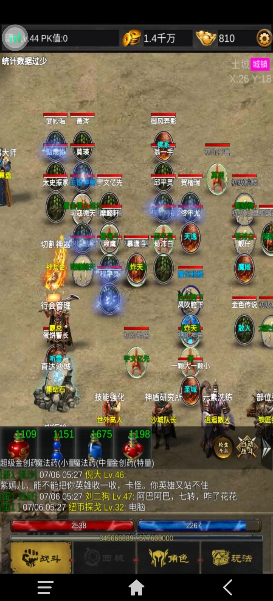 切割神器为切割和斗笠的升级处,行会管理员在加入行会后可明日领取行会福利,技能强化可以升级人物和英雄的技能(英雄要转生后才可以获得),神盾研究处可以提升护盾,是提升战力比较有效的地方但是要注意下其中的精炼,很看运气的东西一般前期如果你不是个托你升不到13级,还请量力而为不然容易心态炸裂。元素洗练这里前期请无视很费资源,部位强化需求黑铁矿前期全套加5或加10即可,黑铁矿优先点神盾比较合适。神秘老人可洗练装备及魂骨的品质,金色为租高品质。传送石中可传送活动地图有时间限制还有爬塔功能,这里只说黄金宫殿,每第十关奖励最高所以要用黄金回退卷反复刷,黄金图对战力要求极高所以不要贪心,前期无需爬太高 10或20层即可。最后是最重要的npc传送员,活动图外的所有地图都可传送。