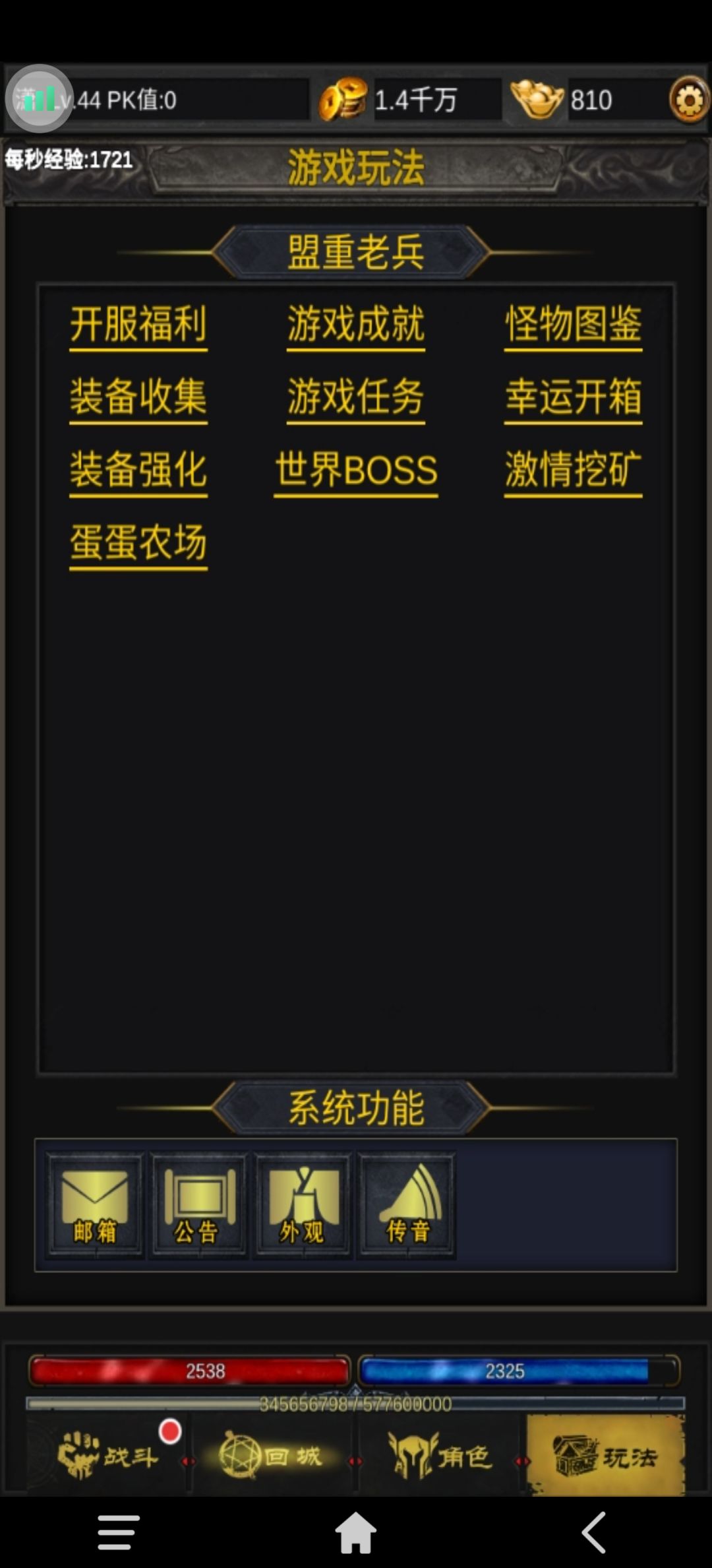 游戏界面游下角的玩法中有各种功能,简单说一下开服福利为每日签到奖励和周活跃度奖励,记得不要漏掉。游戏任务为每日和周常,都要做满。装备收集怪物图鉴游戏成就是图鉴玩法会加属性。幸运开箱是抽奖功能前期会很缺钥匙,所有说一些有用的东西,避坑。500黑铁矿石,加8战神武器,护身戒指可以抽,其他物品自行考虑。农场玩法是收菜,暂时只能获得绑定元宝。世界boss每日必打奖励丰厚,最好和公会的小伙伴们同时去打有机会捡到尾刀。还有一个装备强化功能,这里单说一下戒指开孔的功能,开孔需要金条,失败戒指会消失,开孔会对戒指附加属性种类众多,前期最好的属性是1000血量和30攻击,入过你发现玩了一天别人比你高了两三级那么不用奇怪,肯定是你没拿到30攻击的附魔属性,开服前几天金条稀缺,所有完全看运气也不需要太在意。玩游戏放平心态,娱乐至上。