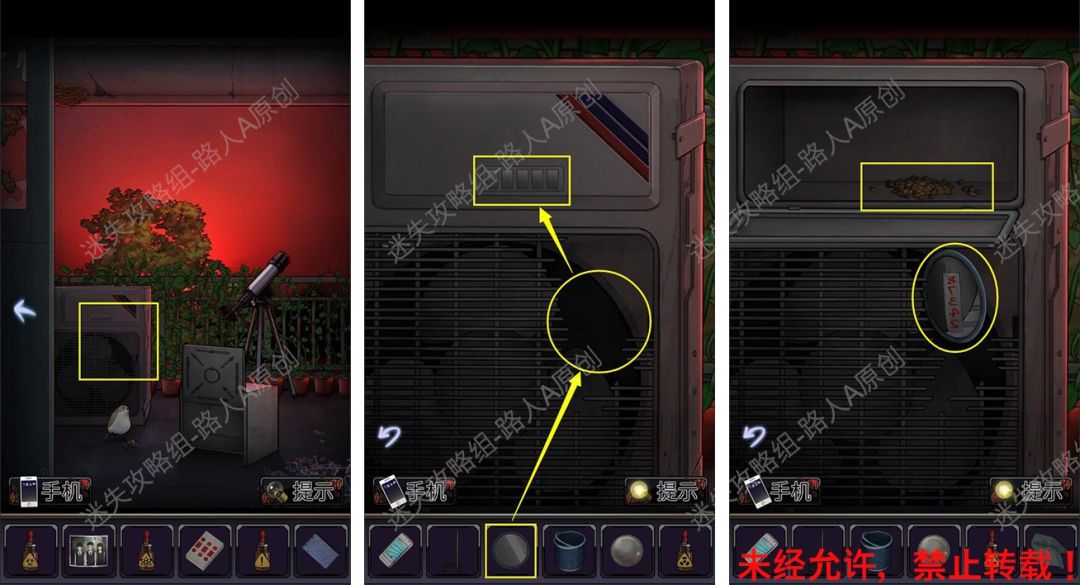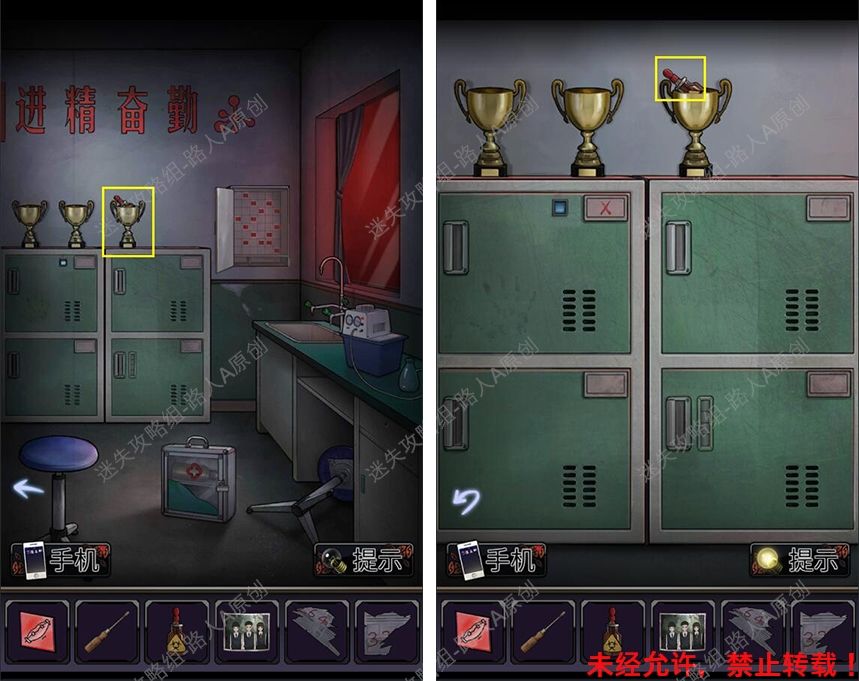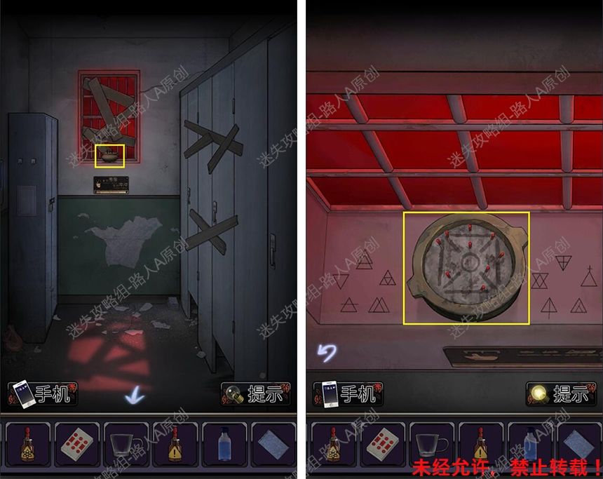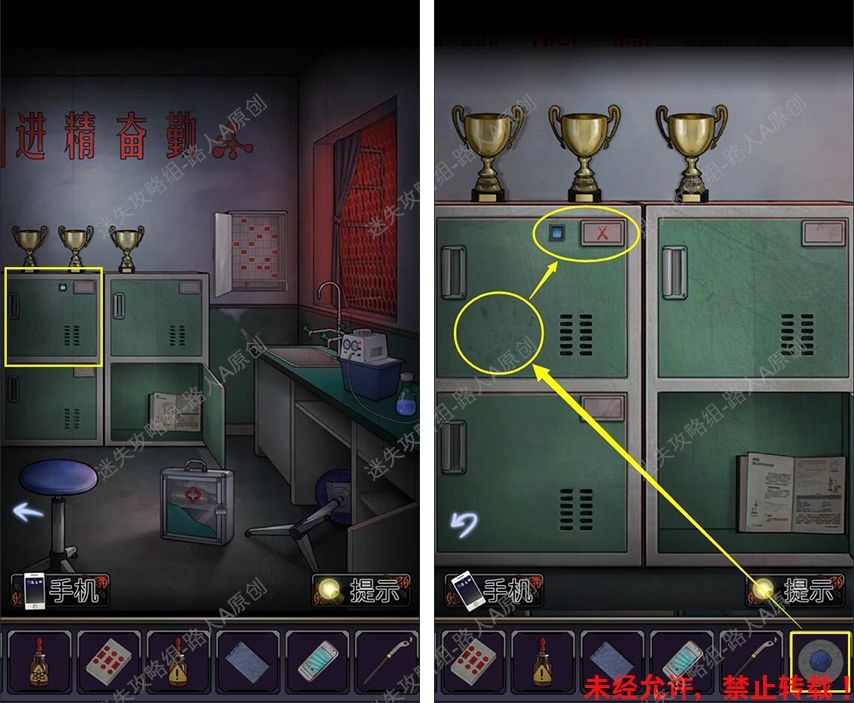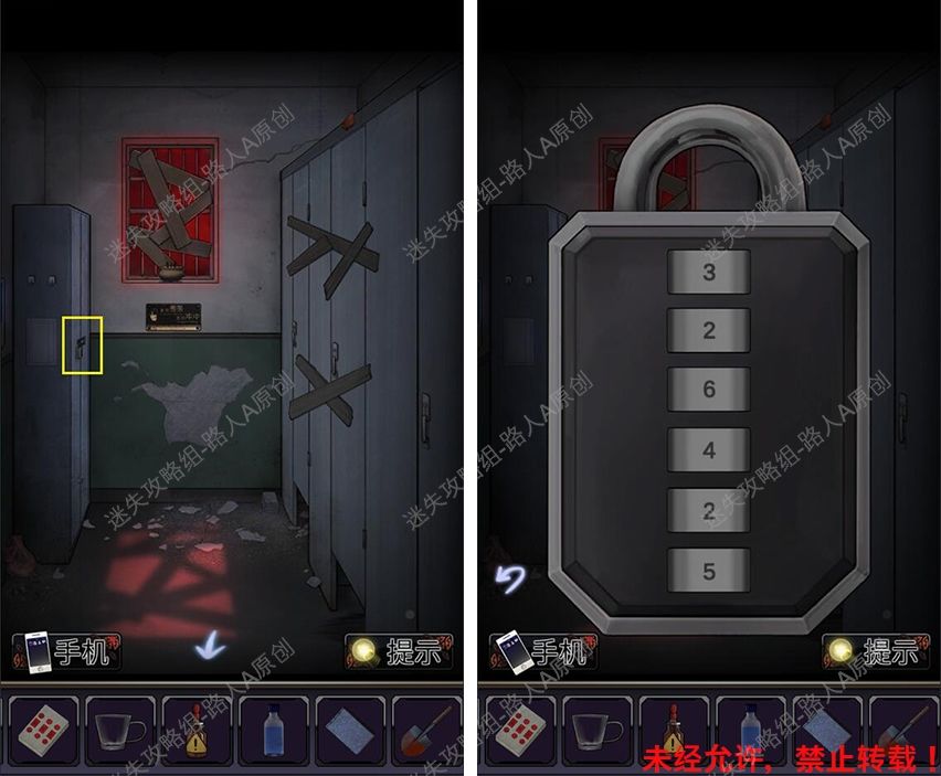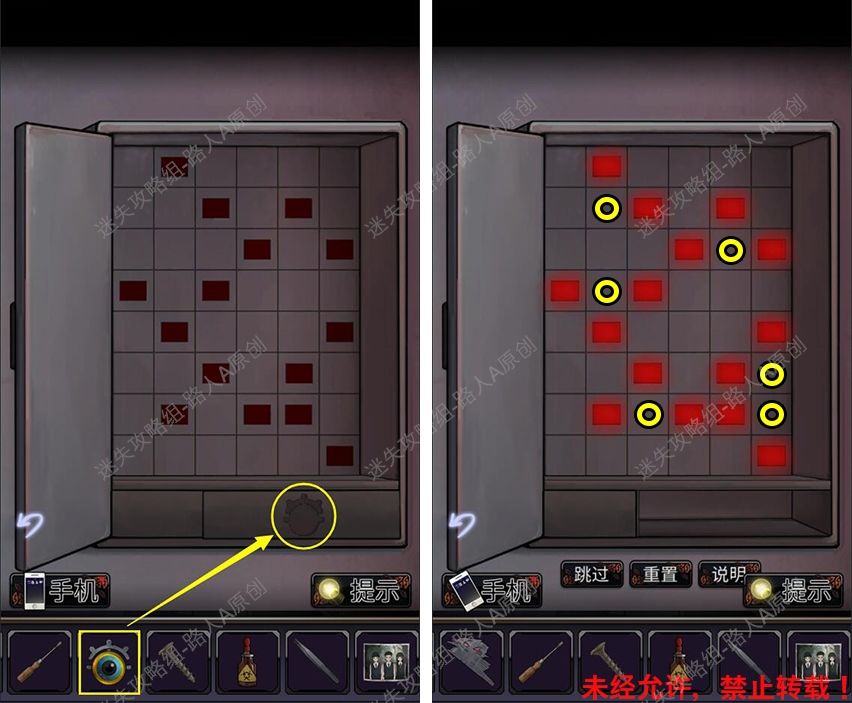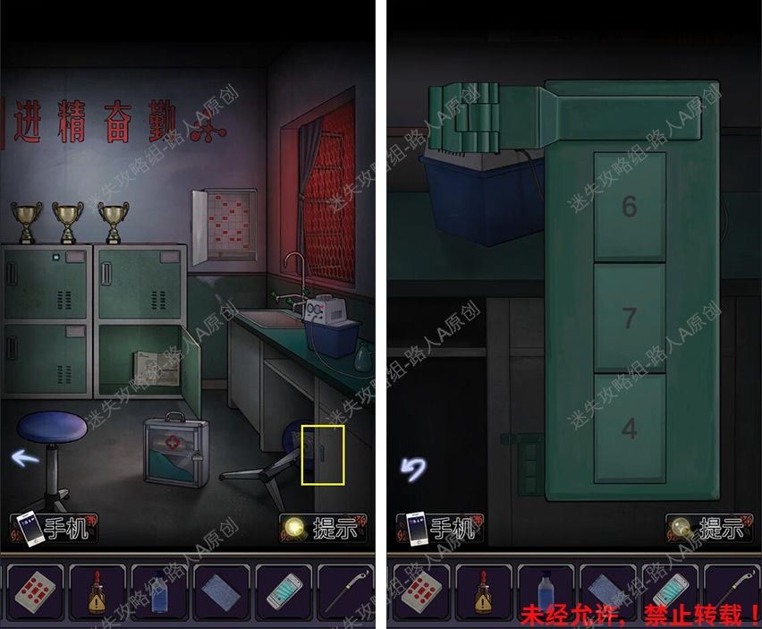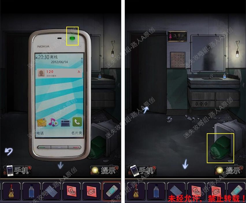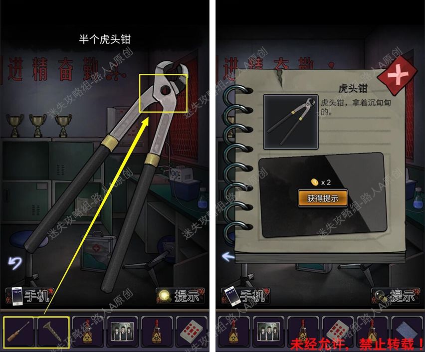 40.前往厕所门口,根据手机闪光的颜色顺序,打开地上的背包,获得【半个虎头钳】。40.1