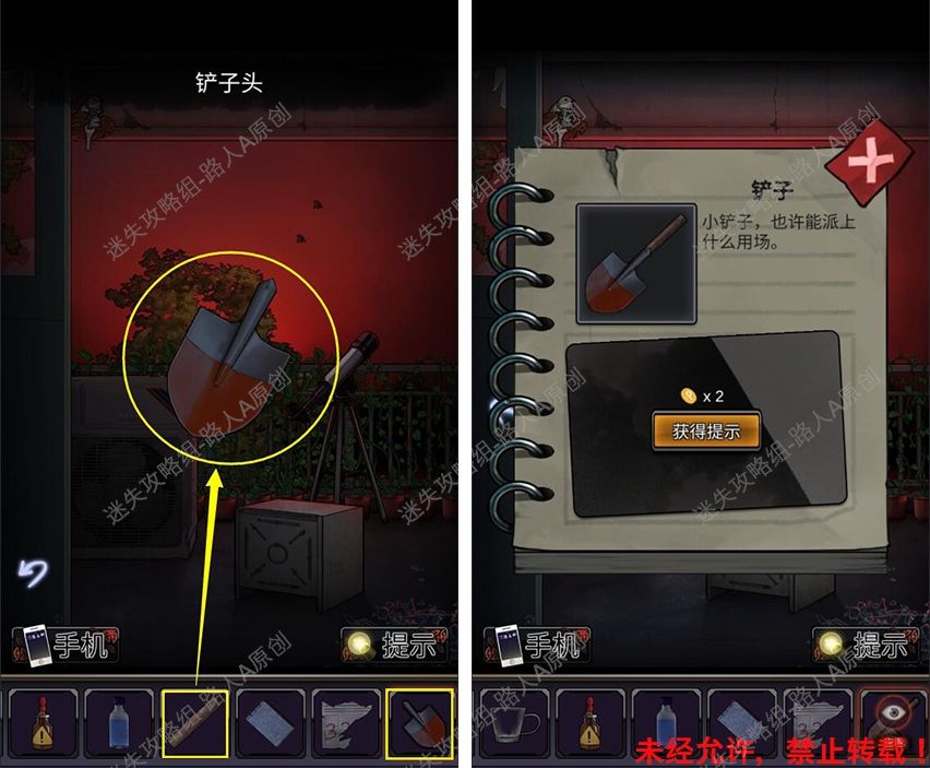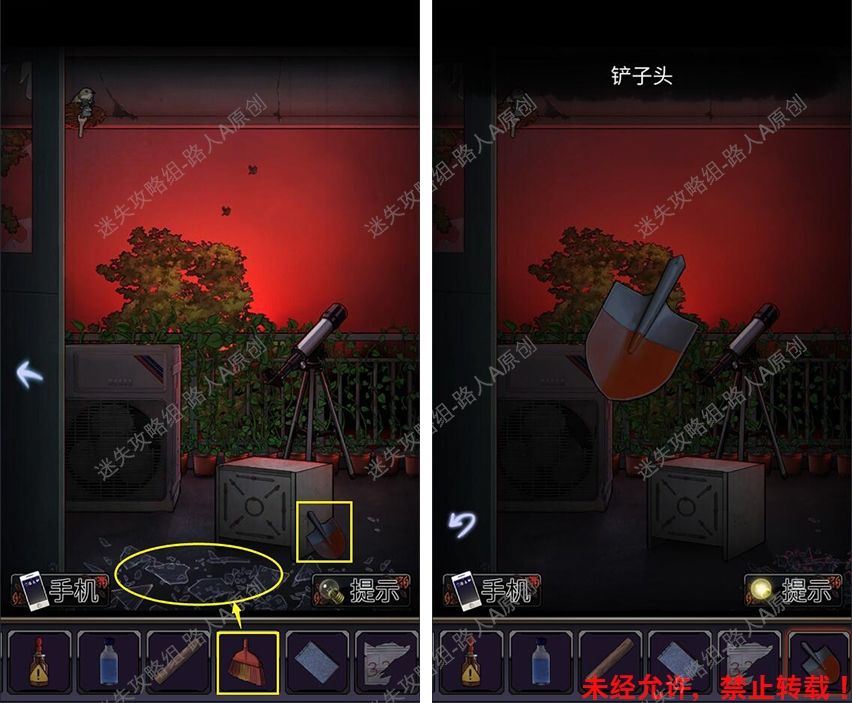 27.前往露台,用【扫把】扫掉碎玻璃,拾取【铲子头】。27.1