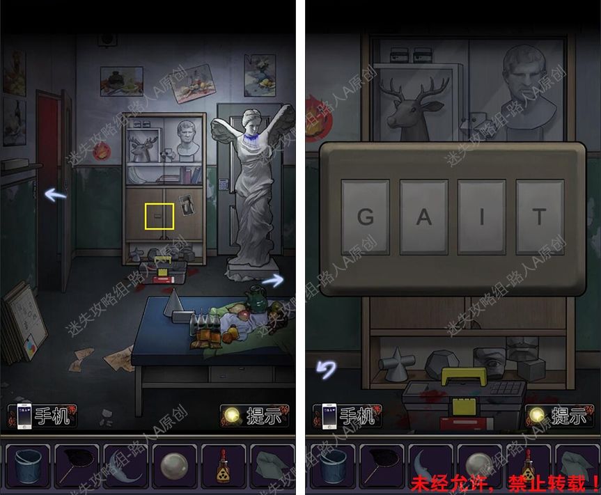 51.对走廊的鱼缸使用【3D眼镜】,得到密码【GAIT】,打开美术教室的柜子,获得【剪刀】。51.1、51.2