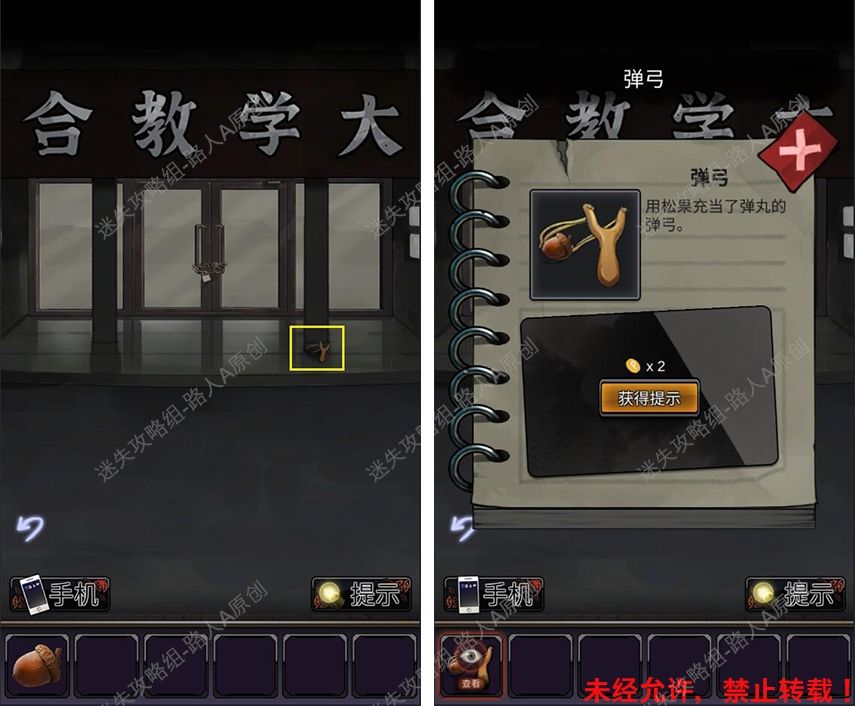 2.在教学楼的门口找到【弹弓】,将【松果】放入弹弓。2.1