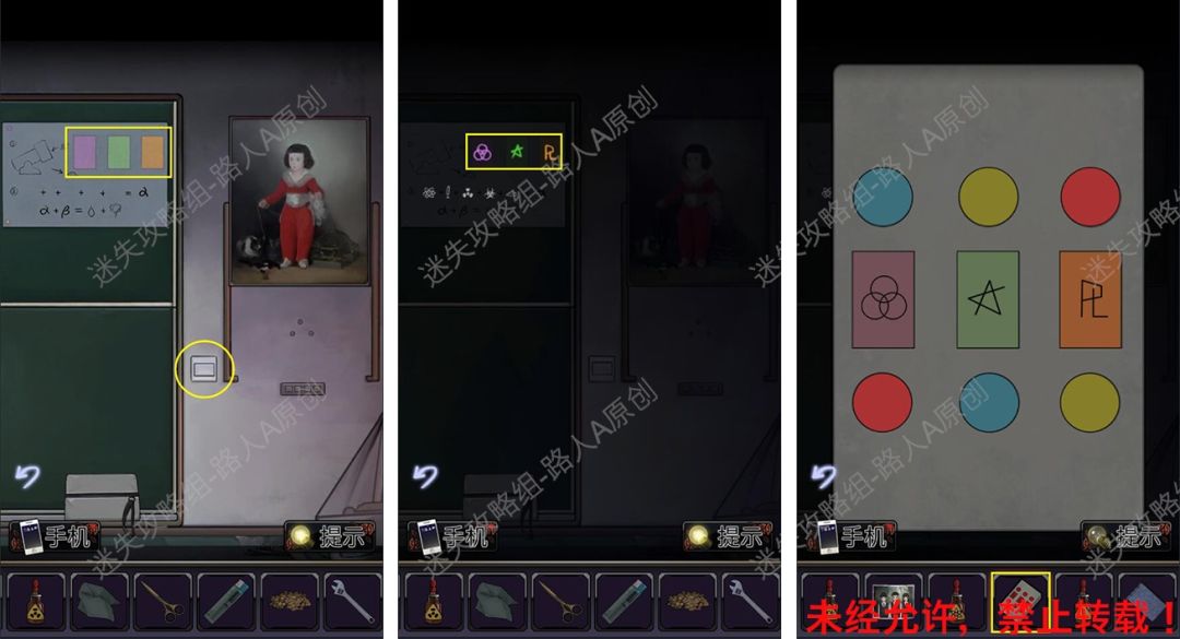 59.关灯,根据黑板上的符号颜色,打开【密码盒子】,获得【唇油】。(上下2个圆形颜色组合等于符号方框的颜色)59.1