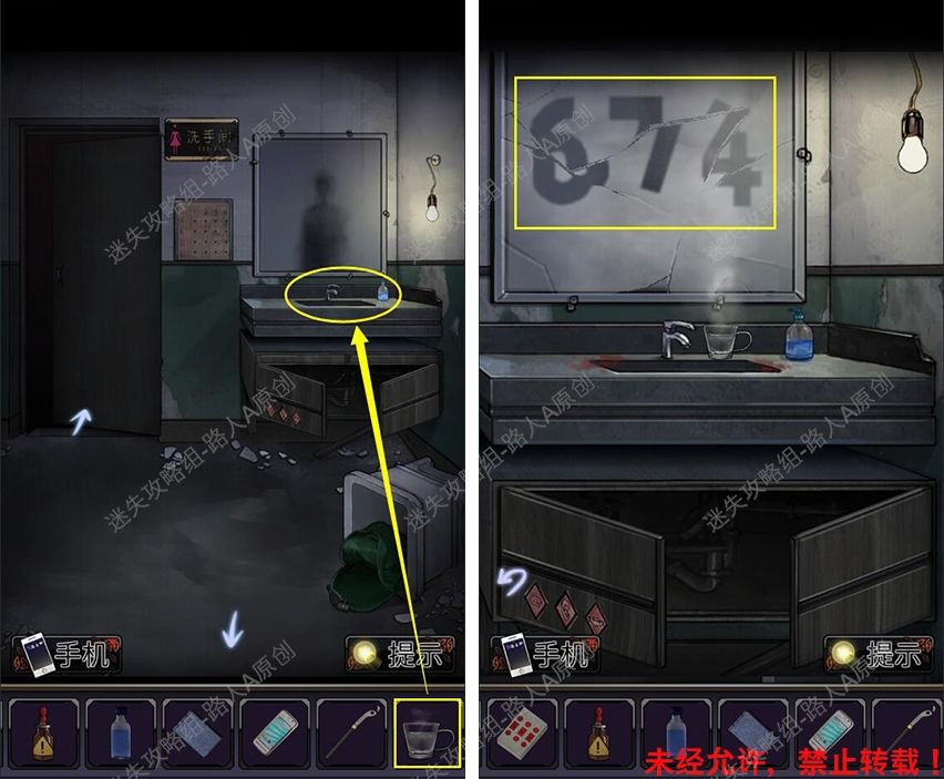 43.前往厕所门口,将【一杯热水】放在洗手台上,得到密码【674】。43.1