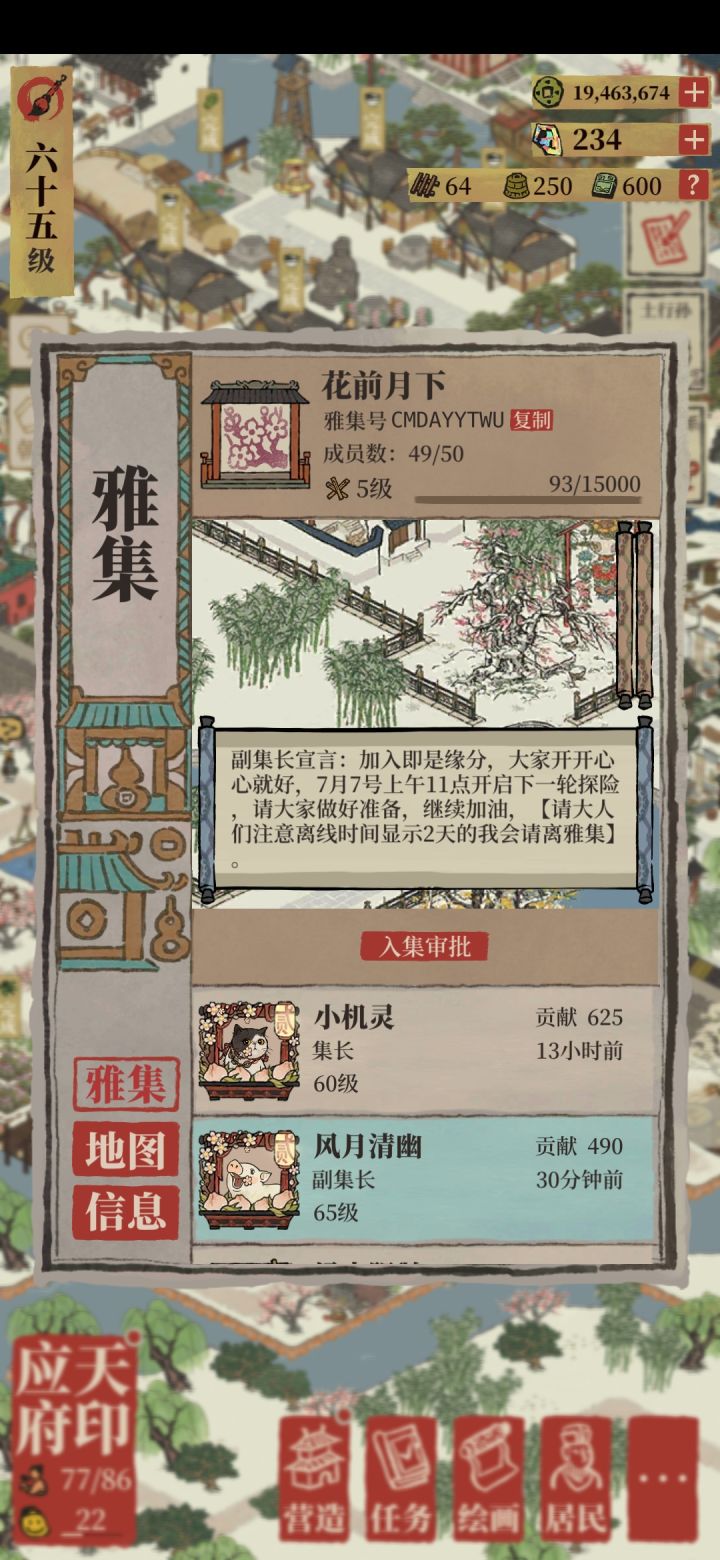 【5级】雅集招募活跃成员,要求等级55+,活动期间每天点满五次最高材料即可,管理会定期清理2天不上线或没按时贡献的成员,如果你是不混不白嫖的官人那就快来加入我们吧!😄😄😄雅集ID号CMDAYYTWU。