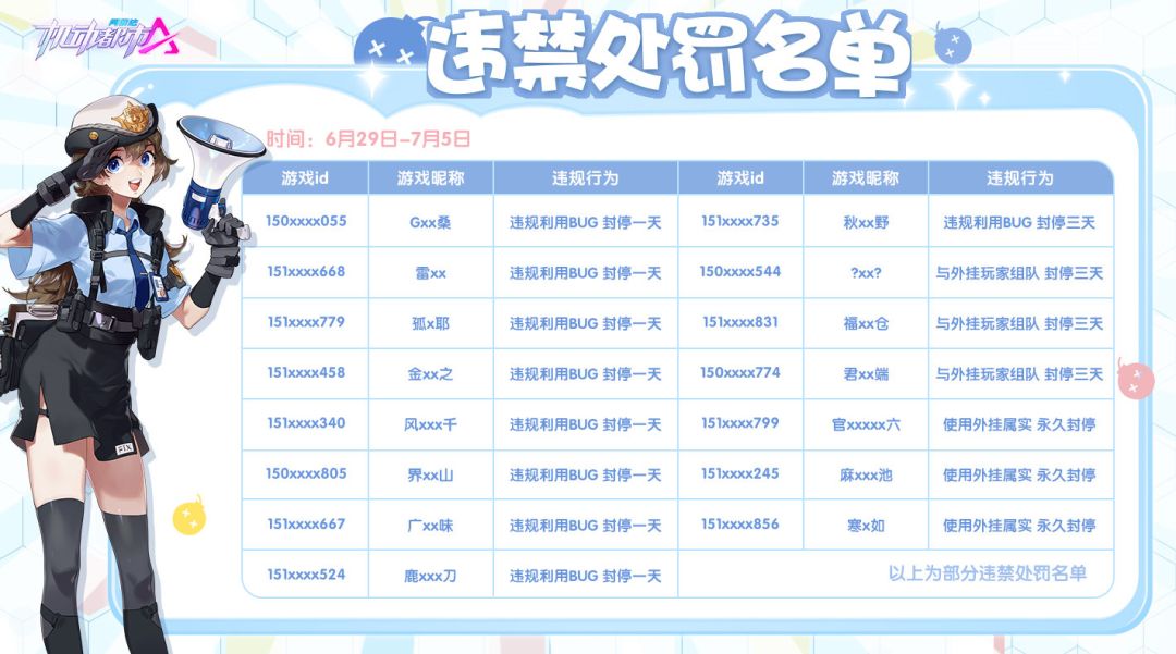 现将6月29日-7月5日的部分违禁处罚名单进行公示: