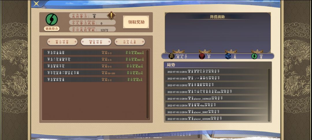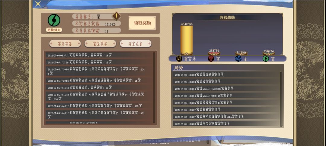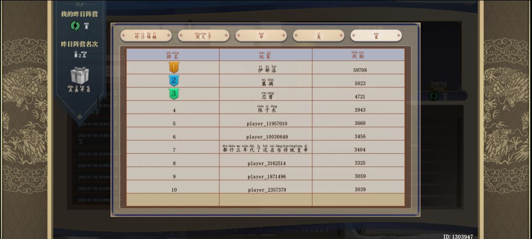当时还没怎么在意,因为这个任务一个计数的都没对上,想着怎么着也是氪金项目不会玩赖的吧,所有今天上线之后就直接领取奖励,结果看了一圈之后结果发现我竟然都不在榜上,寻思着怎么前面的人这么能氪,自己第一天就开了运气不好争不过别人就算了,但是好就好在有个日志记录