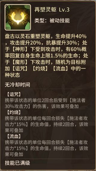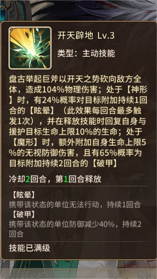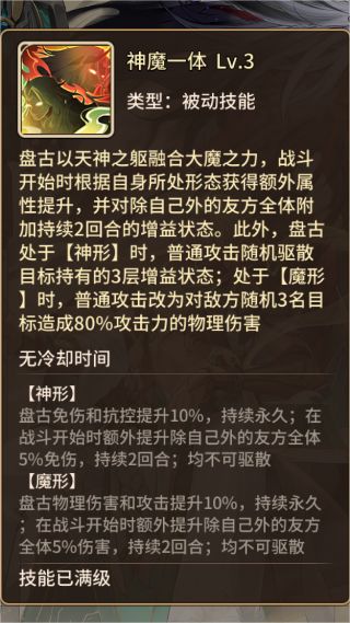 1、盘古具有独特的双形态系统,初始处于神形态,可在英雄养成界面消耗1个盘古本体解锁魔形态,解锁后即可在该界面自由切换神魔形态,切换后实时同步至不同玩法布阵;