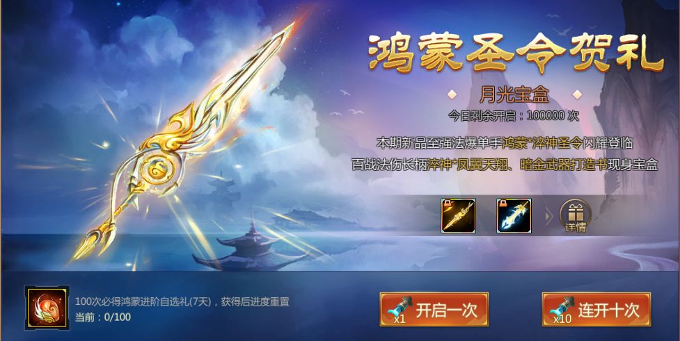 月之匙*10可以在月光宝盒来一次痛快的十连抽,有机会获得鸿蒙*淬神圣令等顶级装备。