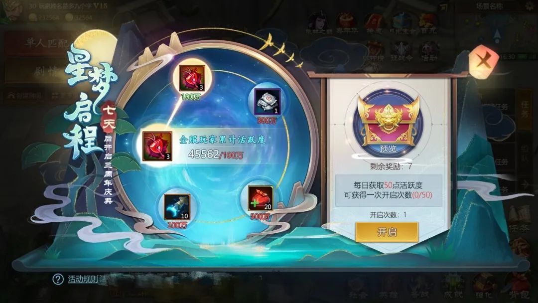 星梦启程活动期间玩家每日活跃度达标即可开启周年礼盒,