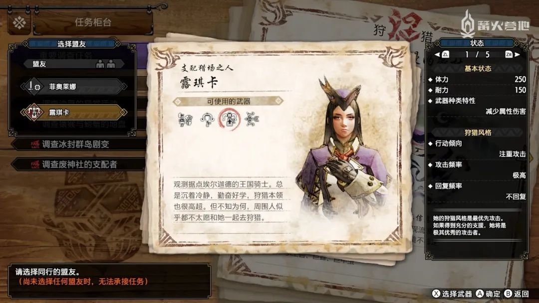 对此感兴趣的玩家需要现在「盟友同行任务」中与对应的 NPC 一起完成过狩猎任务之后,就能够在「重要调查任务」中根据你想要狩猎的怪物特点自由选择不同的 NPC ,选配不同的武器类型了。