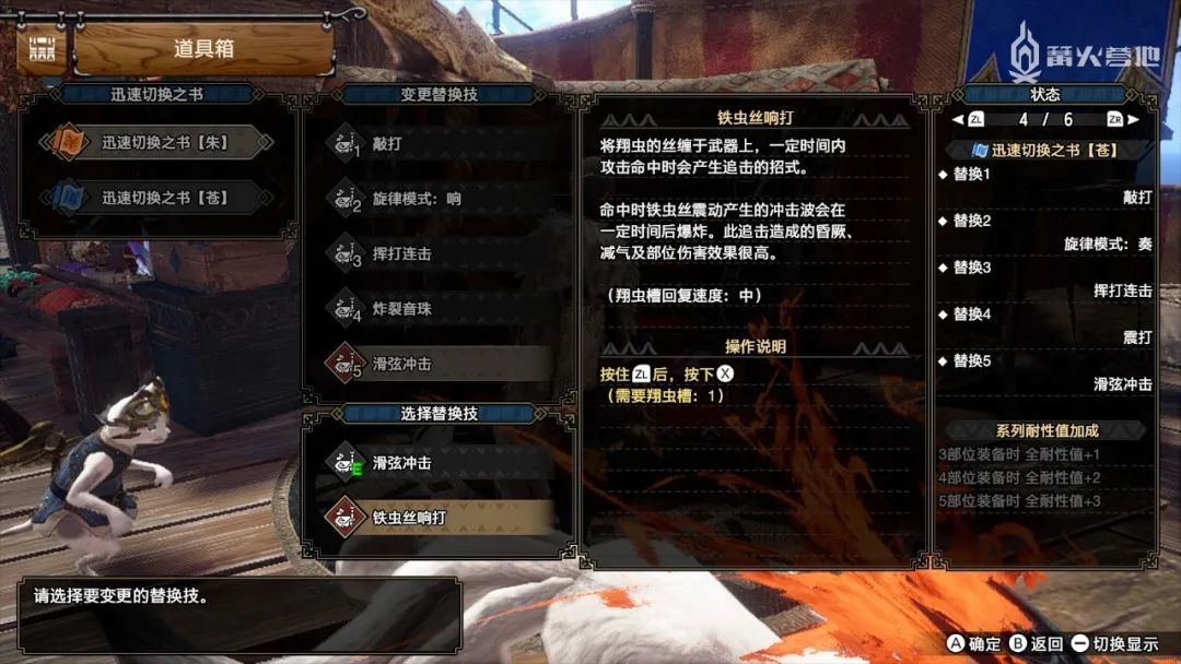 现在玩家可以在出任务之前可以预先给「迅速切换之书【朱】」「迅速切换之书【苍】」中设置两套不同的替换技在战斗中实时进行切换,就能实现像《DMC 5》里但丁切换职业一样的效果,以不同的招式行云流水般应对怪物。即便是对于战斗苦手的玩家,这样的实时切换也意味着大家可以在战斗中配上多一套「翔虫技」的大招,因地制宜的施放稳步增加伤害。