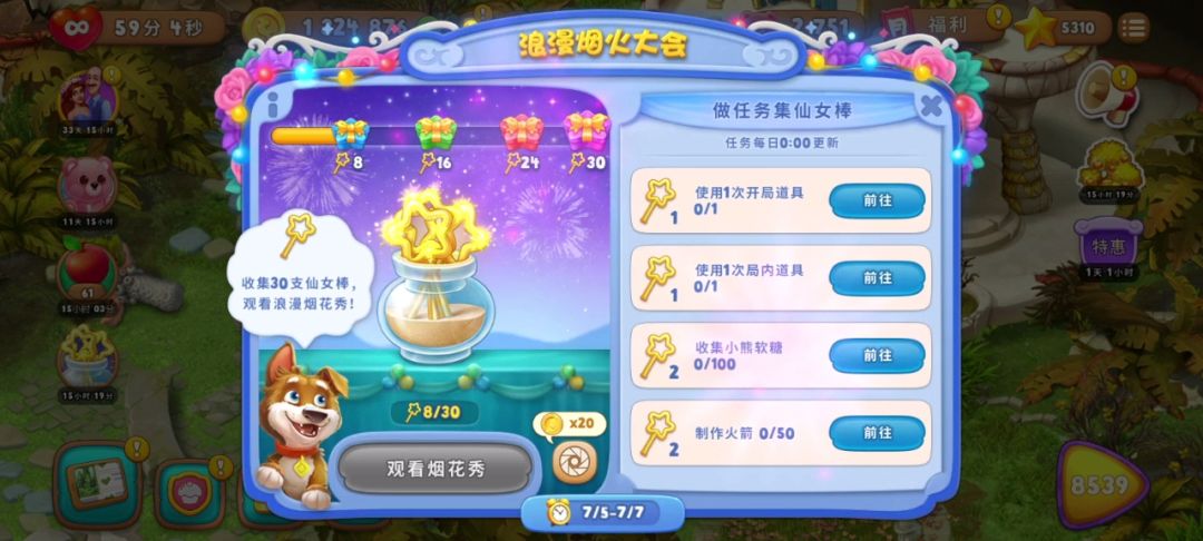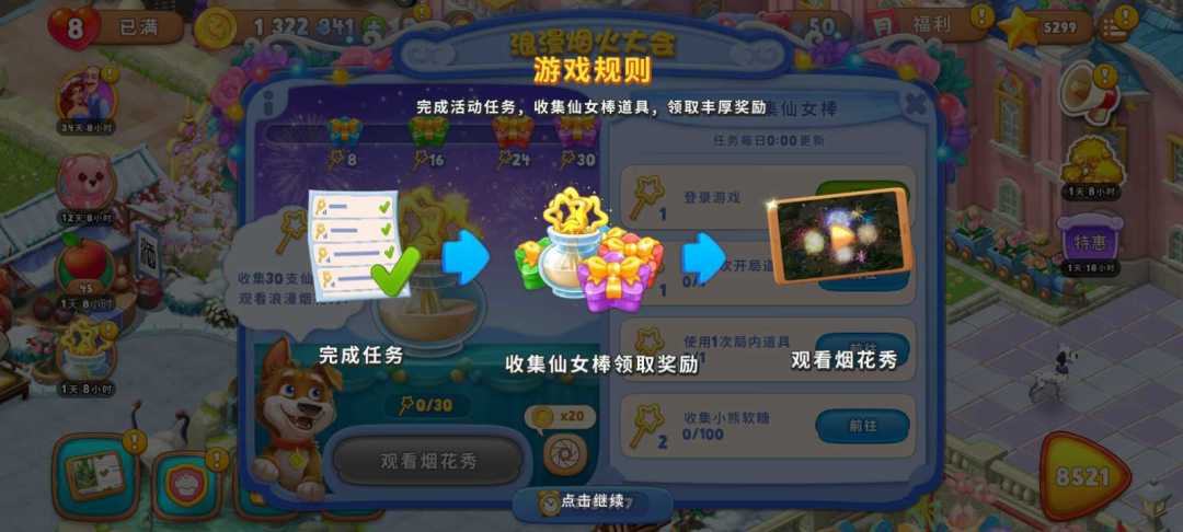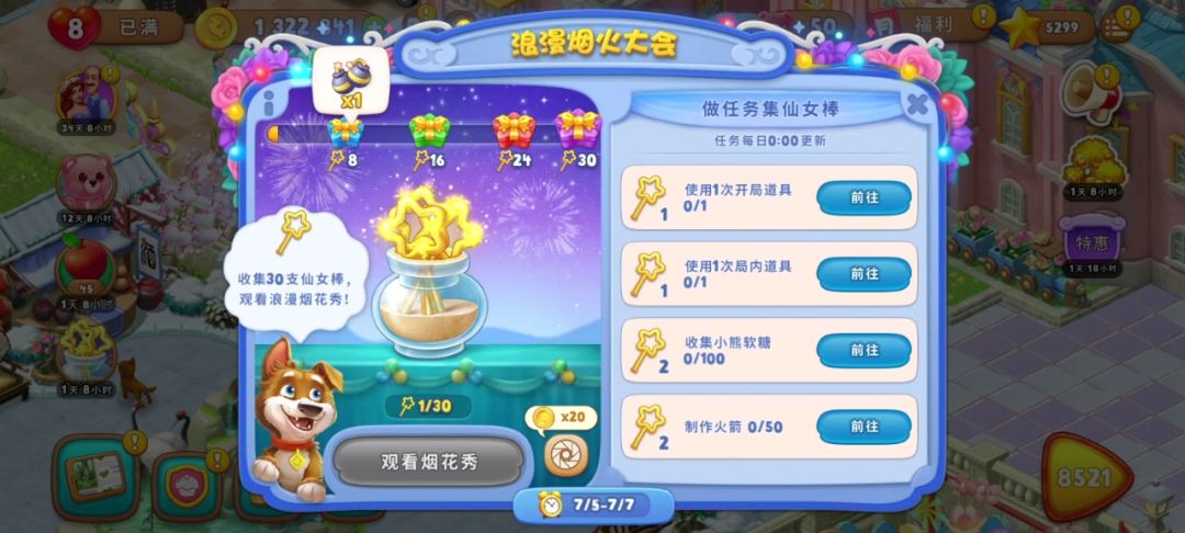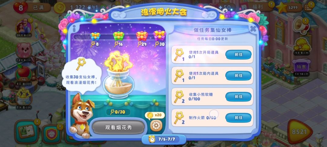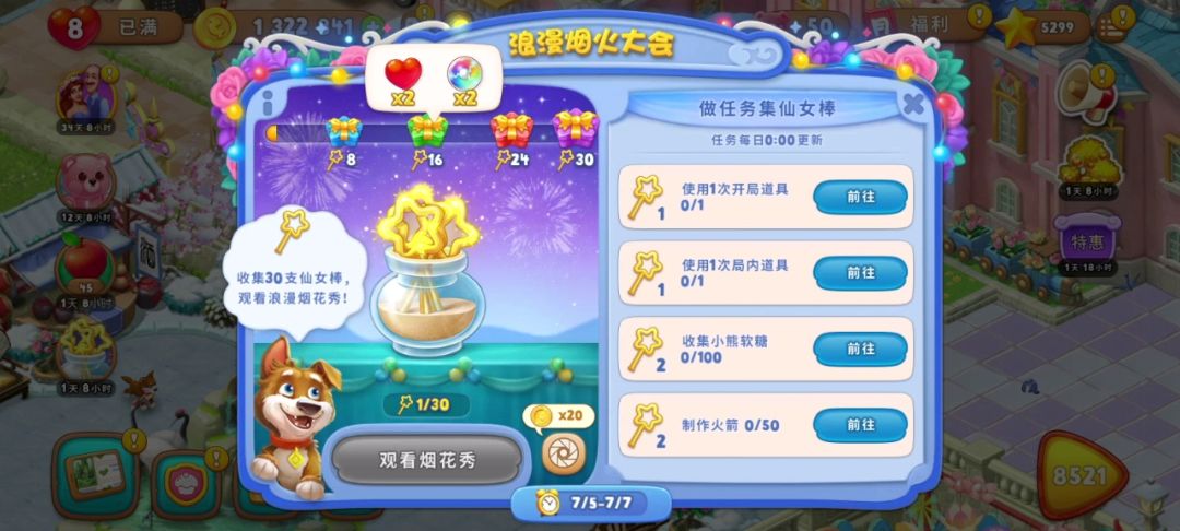 仙女棒达到30,奖励500金币、开局三道具×2、无限体力30分钟,可以观看烟花秀