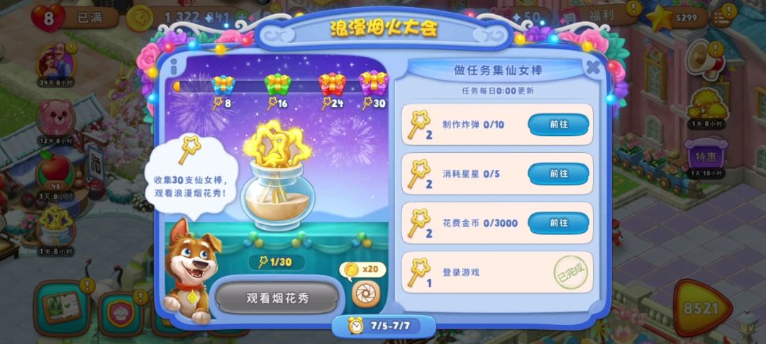 完成每日任务收集仙女棒道具,共8个任务一天最多能获得13个烟花棒,具体任务如下:
