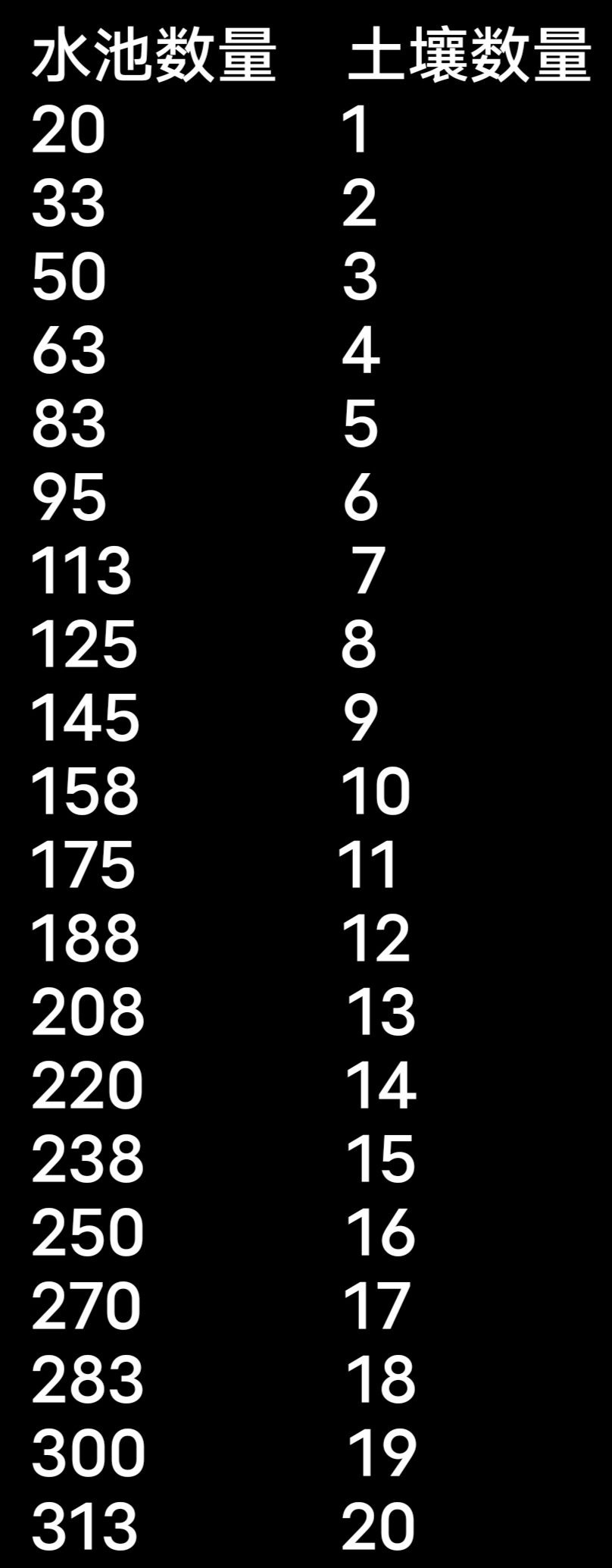 提供一个水池摆放数量和获得土壤的数据图(土壤数量7的那条注意一下,因为小森灵内部算法问题18个一起合成只能得6个。被拆分成6个3合成,并不算五合)