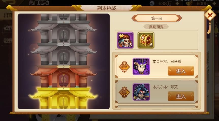 活动简介:本活动为活跃挑战活动,活动副本共有7层,每层4关。活动开启后,每日解锁一层可进行挑战,挑战成功即可获得丰厚奖励。