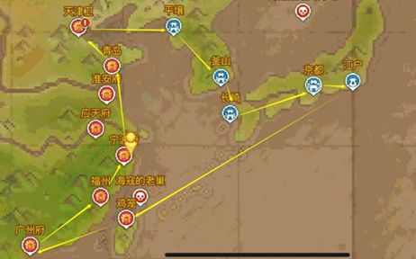i. 路线1:天津卫-平壤-釜山-京都-鸡笼-广州-福州-青岛,最推荐的萌新跑商路线,距离短、时间少、收益高,并且几乎遇不到海盗,可以大大缩短跑商成本和风险,提高利润