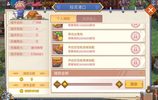 c) 投资是什么:直白点就是给城市捐钱,用你赚取的金币投资城市,这里需要花费大量的小钱钱o(╥﹏╥)o。但是带来的好处就是解锁对应的各项权益,包括城市特色物品、稀有道具、造船权限、高级火炮、降低税率等等,这些都是非常可观的收益,当然具体还是要看每个城市具体有哪些权益,玩家自己可以决定优先投资哪些城市
