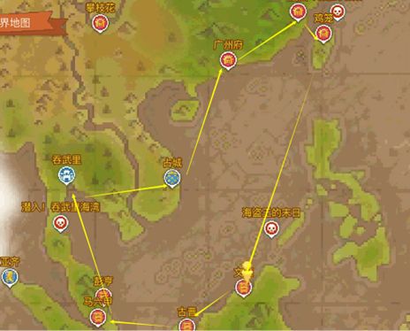 ii. 路线2:广州-福州-鸡笼-文莱-马六甲-吞武里-占城(可以看成路线1的延伸,扩大到东南亚各城市),这条路线上物品更丰富,距离、时长合适,利润高,当路线1的城市还在补货时间内,可以加入这条线路,不浪费时间(唯一需要注意的是,此处会遇到海盗,需要对自己船只有一定的装备和提升,不然遇到海盗打不过,得不偿失)