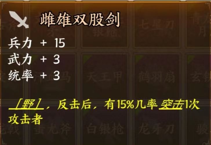 从装备特效来看,对比许褚[虎侯]天赋:反击后,对攻击自己的野外相邻敌军额外攻击1次。雌雄双股剑触发收益较高,但15%的触发概率很低。在敌方回合发动100%系数的突击,看上去很美好,还能联动马岱、关平的协战,贾诩的趁势等技能。但是首先他是被动效果,挨打反击后才有几率触发特效,而且实战中武将若被敌方攻击打残,即便反击+突击,能造成的伤害也有限。因此更推荐用于碰运气触发特效,比如金关羽绝伦、华雄反戈、兵法猛击等。又或者装备给自身生存能力和输出能力都很强的武将,但这种武将更适合带防具进一步加强生存,何必带雌雄赌这低概率。雌雄双股剑主要还是弱在触发概率上,我觉得如果有30%触发几率就很强了。