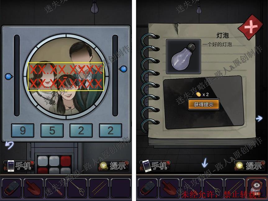 36. 根据照片线索,得到密码【9522】,在机关输入密码,得到【灯泡】。(用日期【22.11.2010】减去【13.06.1988】,22减13等于【9】,11减6等于【5】,2010减1988等于【22】,由此得到密码【9522】。)36.1、36.2、36.3