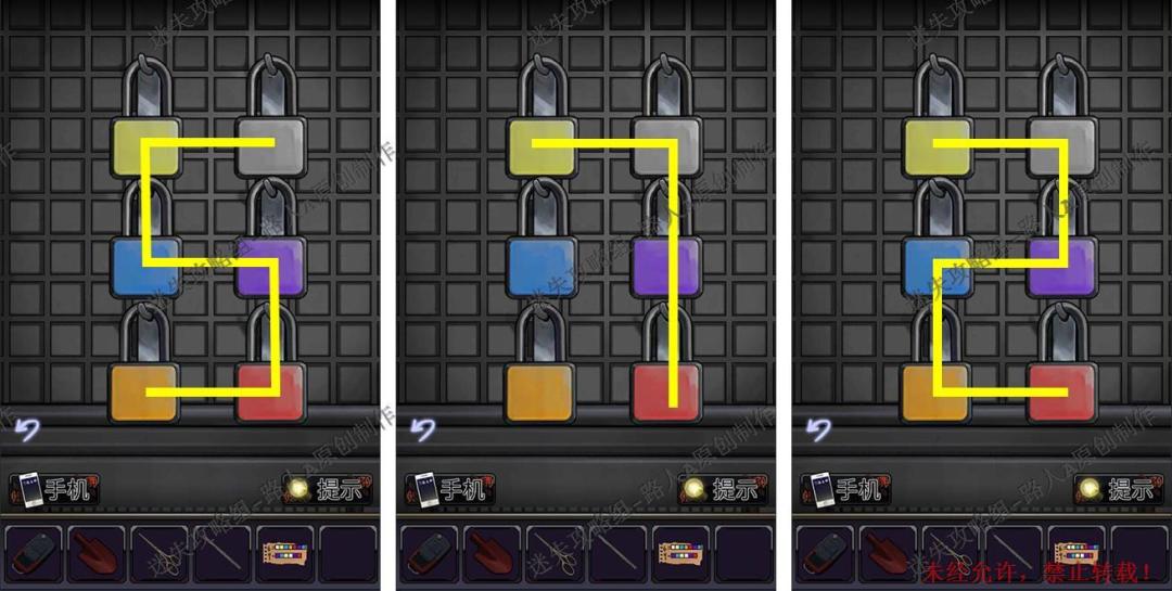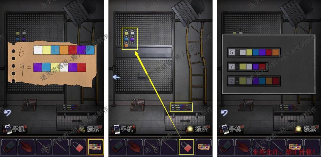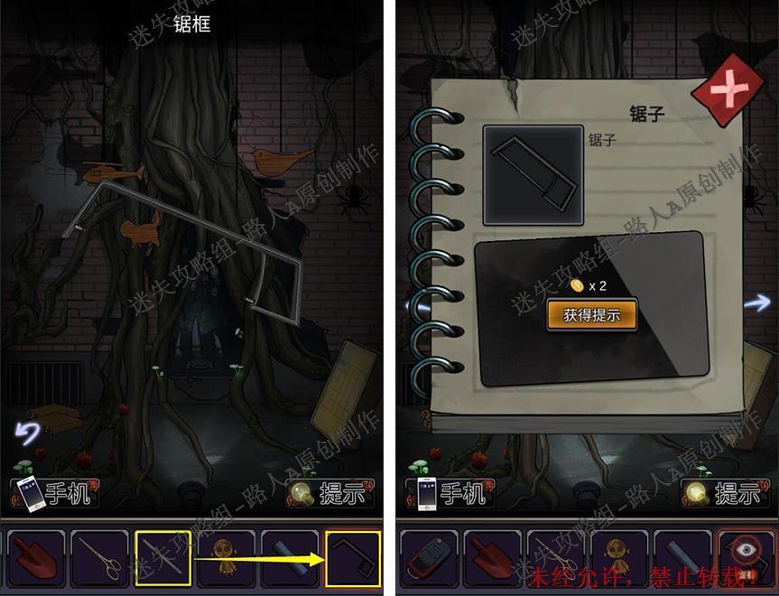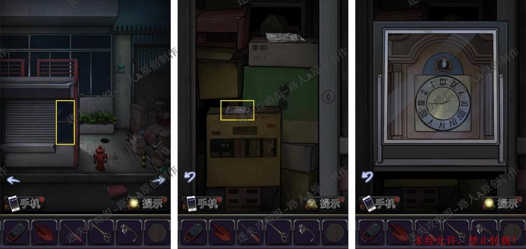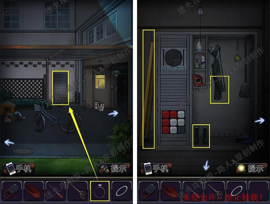 33. 用【戒指】打开储物室的门,拾取【梯子】、【机关道具】、【纸条】。33.1、33.2
