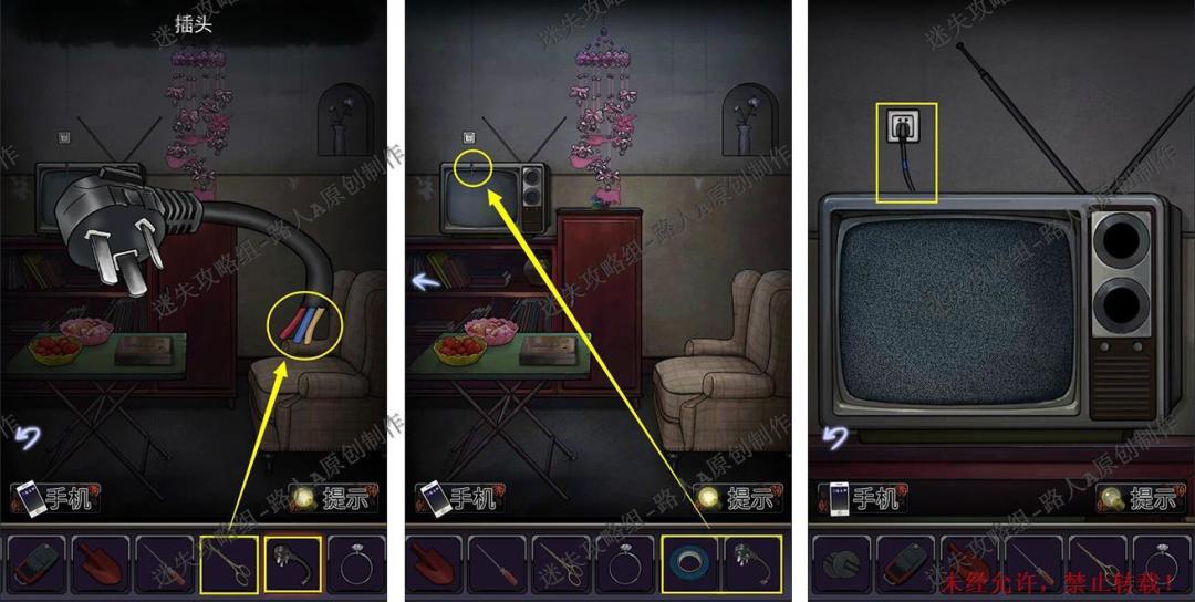31. 用【剪刀】剥开插头的电源线,用【插头】和【胶带】修复电视的电线,插好电线插头。31.1