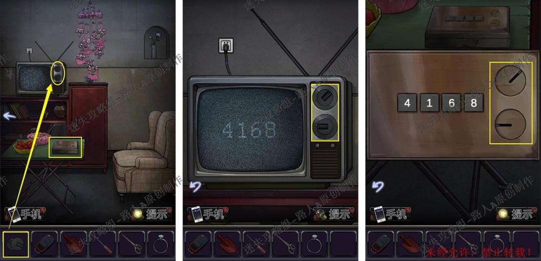 32. 根据桌上盒子的线索,将【旋钮】放入电视并且调整旋钮,得到密码【4168】,打开盒子,得到【刻度环】。32.1