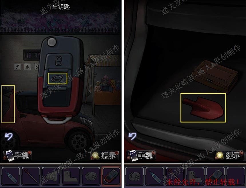 5. 用【车钥匙】打开汽车的后备箱,拾取【铲子头部】。5.1